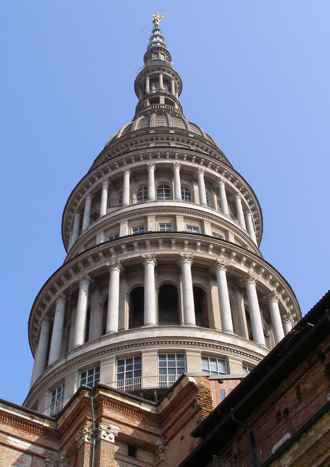 In anni in cui altrove sta prendendo piede l’ "architettura del ferro", l’Antonelli sceglie di utilizzare ben 2046 metri cubi di mattoni di provenienza esclusivamente locale, e dà un saggio dell’abilità delle maestranze novaresi. L’impresa costituisce un unicum nella storia dell’architettura mondiale, e rappresenta una delle strutture murarie più ardite mai concepite. I documenti del cantiere narrano di come l’architetto imponesse nei suoi capitolati che ogni materiale fosse di primissima qualità, così da evitare che la stabilità della sua "invenzione" venisse compromessa.